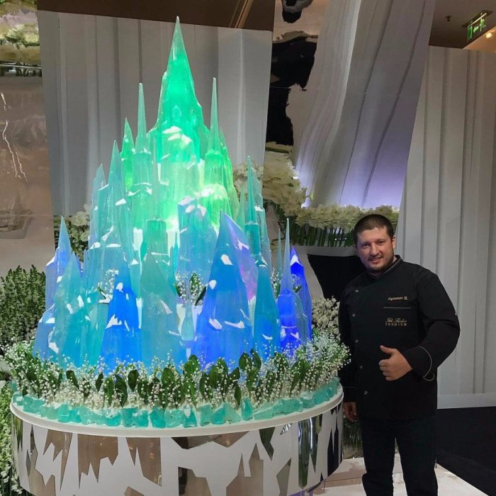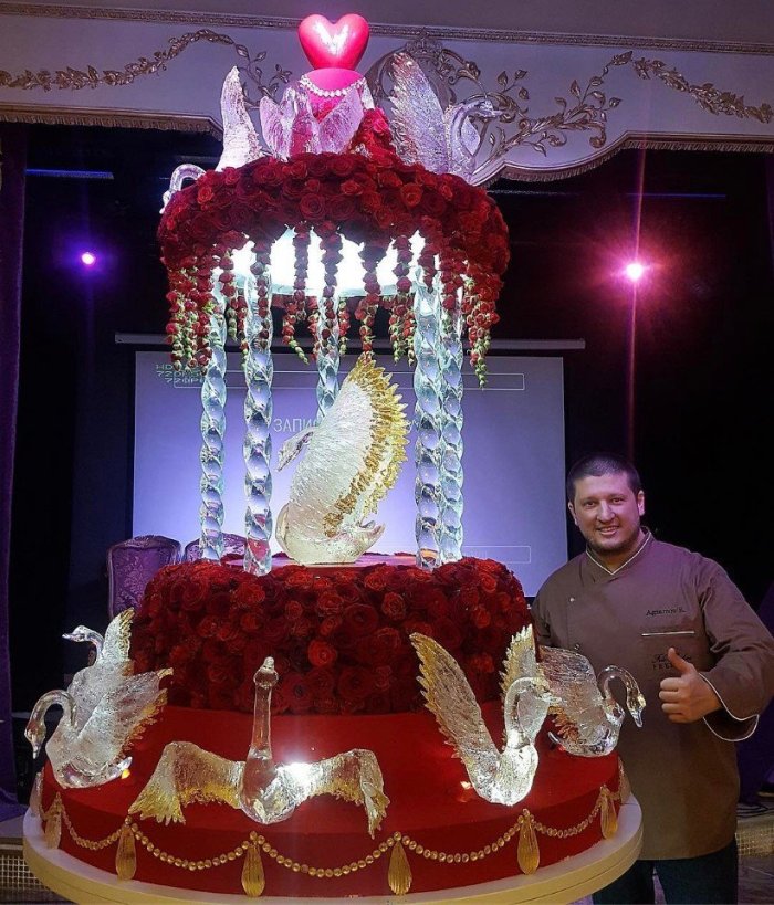 — Не имею права сообщать, кто купил этот торт. Это была свадьба, — рассказывает Ренат Агзамов. — Торт весил порядка 4 тонн, был 7 метров в длину и 3,5 метра в высоту. Внутри этого торта были мониторы. И чтобы они, не дай бог, не загорелись, пришлось использовать внутри торта систему вентиляции. На этот торт у меня ушло три года, хотя по факту я его делал три месяца, но все это время я им жил, им дышал, о нем мечтал. И когда появился заказчик, который готов был его профинансировать, это был один из самых счастливых моментов в моей жизни!
